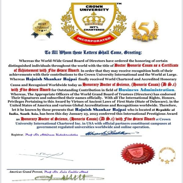 SmartGaon Founder & Chairman Shri Rajnish Bajpai Ji was awarded as honorary doctorate (Doctor Honoris Causa) by The Crown University International Chartered, U.S.A. in the field of Business Administration.
